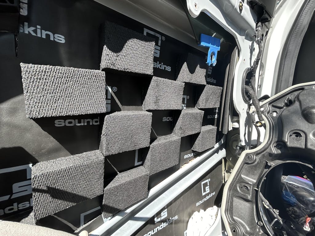 Ordered a box of 72 tiles and also a starter bag of 18 tiles in preps for my 2-way passive system. I installed 27 tiles in each of the front doors and 18 tiles in each of the rear doors. Very easy to install as demonstrated in the Sound Treatment Video. The backing was easy to remove once I gently cut a straight line down the middle of the backing, which resulted in an easy removal of the backing. Also, after a week I removed a door panel to check for any moisture and also to check the tiles to ensure quality adhesion. Found everything intact and good to go.