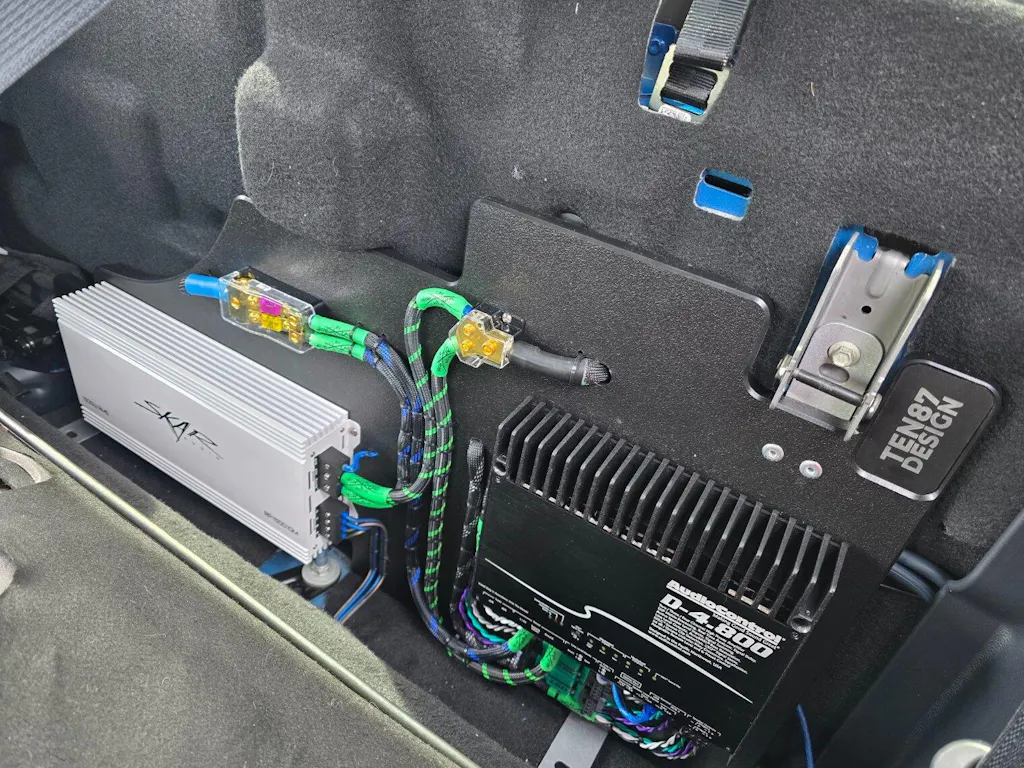 The enclosure itself is absolutely gorgeous too.. It was well worth the 3 month long wait, that's for sure! The craftsmanship is bar none, and it seamlessly blends in with my interior. I couldn't be happier with how it turned out! The LED lights on the front are controlled via the XKChrome app which is pretty dang cool as well! The icing on the cake🤌
