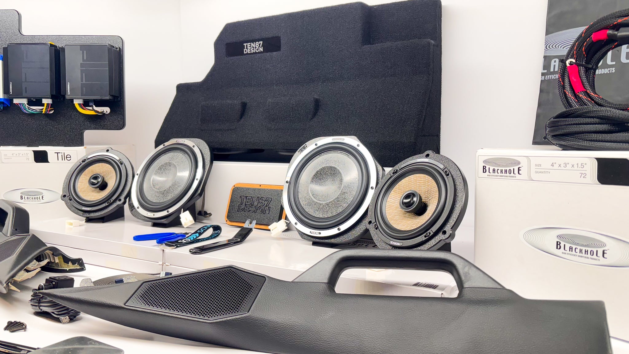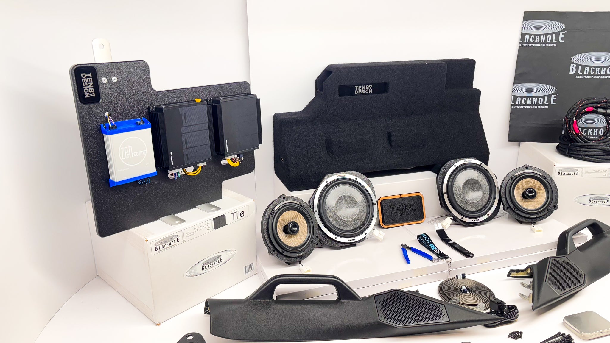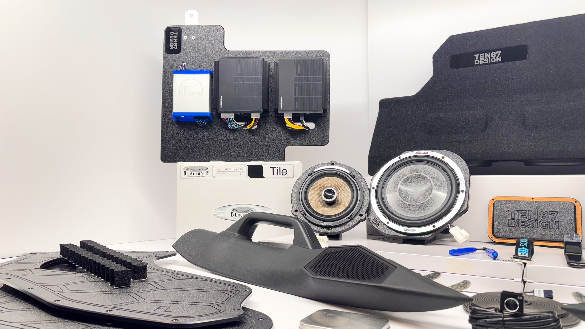 • ~ Mosconi Pico Series Class D amplifiers—1,420 watts of exceptional power, sound quality, and compact design for our behind-the-seat packages